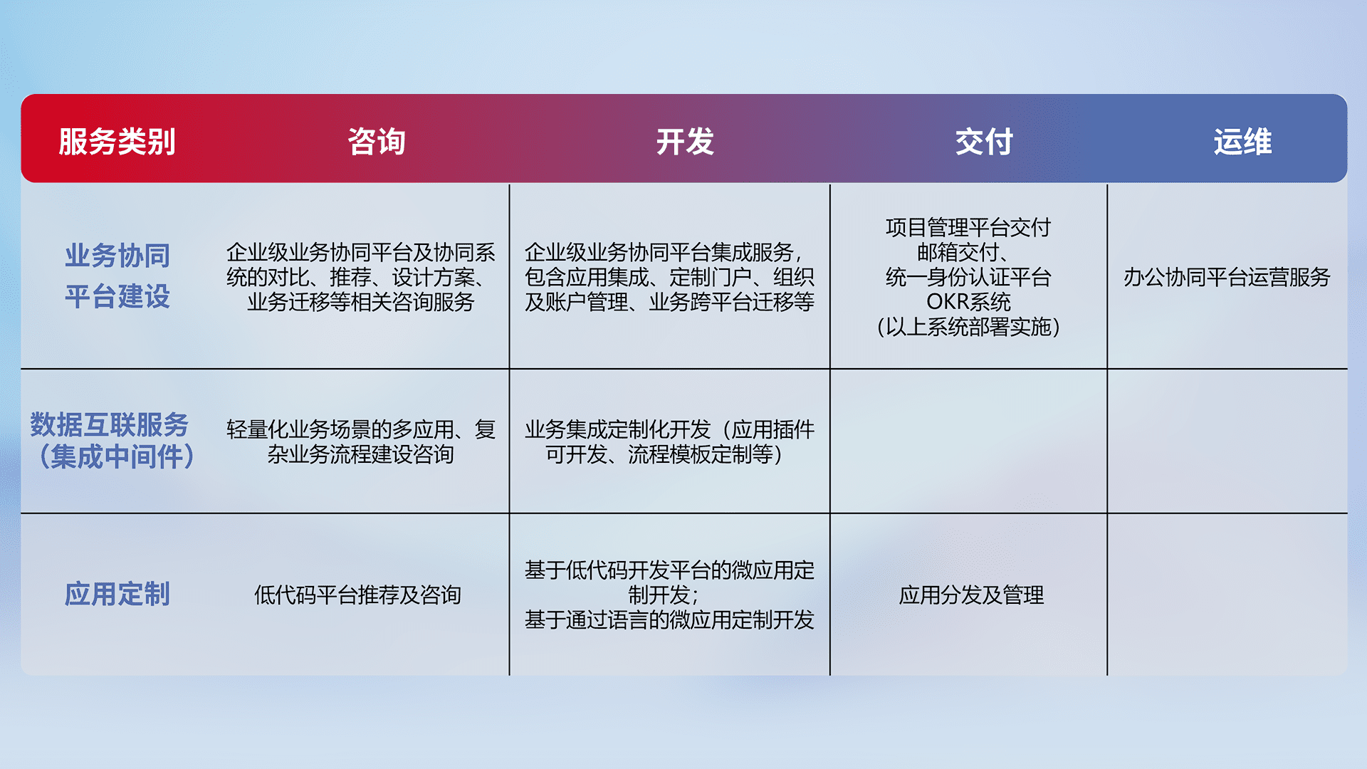 针对钉钉、、、、企微、、、IDaas等平台级产品提供产品的规划、、方案、、、、交付、、、、定制化开发等服务,,实现如统一协同办公、、、智能客户服务、、、、混合会议管理、、、智能数据查询、、等业务场景,,实现数字化转型。。。