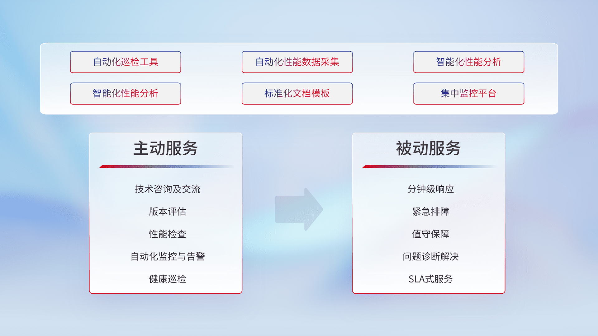 智能化工具和标准化文档,,,保障服务质量,,,提供主动服务(包含技术咨询、、、、版本评估、、、、性能检查、、、自动化监控与告警、、、健康巡检)和被动服务包含(分钟级响应、、、、紧急排障、、、值守保障、、问题诊断解决、、、SLA服务)。。。